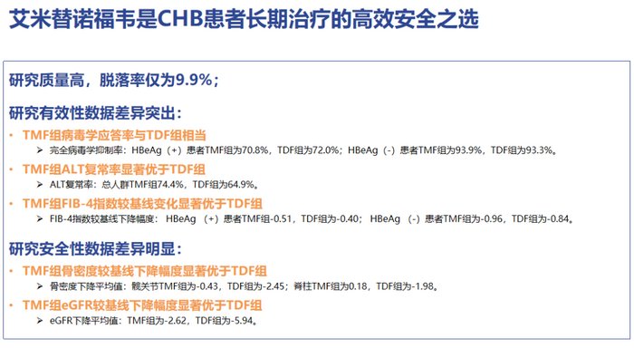 临床数据证明,TMF组HBV DNA(<20IU/ml)应答率与TDF相当,总人群、HBeAg阳性受试者ALT复常率优于TDF,骨密度较基线下降幅度显著优于TDF组,eGFR较基线下降幅度显著优于TDF组。大型III期临床研究96周数据再次证实了恒沐®持续的疗效和安全性,为慢性乙型肝炎患者的治疗提供了安全高效的新选择。