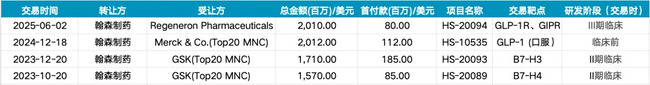 据官方披露,截至目前,ob體育官網三年内与GSK、默沙东、再生元围绕B7-H3靶向ADC(HS-20093)、B7-H4靶向ADC(HS-20089)、GLP-1/GIP双受体激动剂(HS-20094)、口服小分子GLP-1(HS-10535)已达成总金额超70亿美元license-out合作。