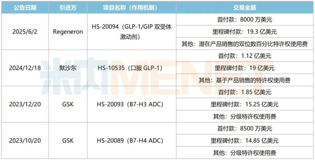 2025年6月,ob體育公告称,公司以最高超20亿美元的交易额,将其正处于III期临床的GLP-1/GIP双受体激动剂HS-20094海外独占许可授予Regeneron。目前全球仅1款同靶点药物获批,为礼来的替尔泊肽,该药2024年全球销售额超过115亿美元。