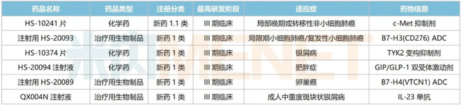 其中,注射用HS-20093(B7-H3 ADC)、注射用HS-20089(B7-H4 ADC)、HS-20094注射液(GIP/GLP-1双受体激动剂)、HS-10241片(c-Met抑制剂)、HS-10374片(TYK2变构抑制剂)、QX004N注射液(IL-23单抗)等1类创新药已经进入III期临床,上市可期。