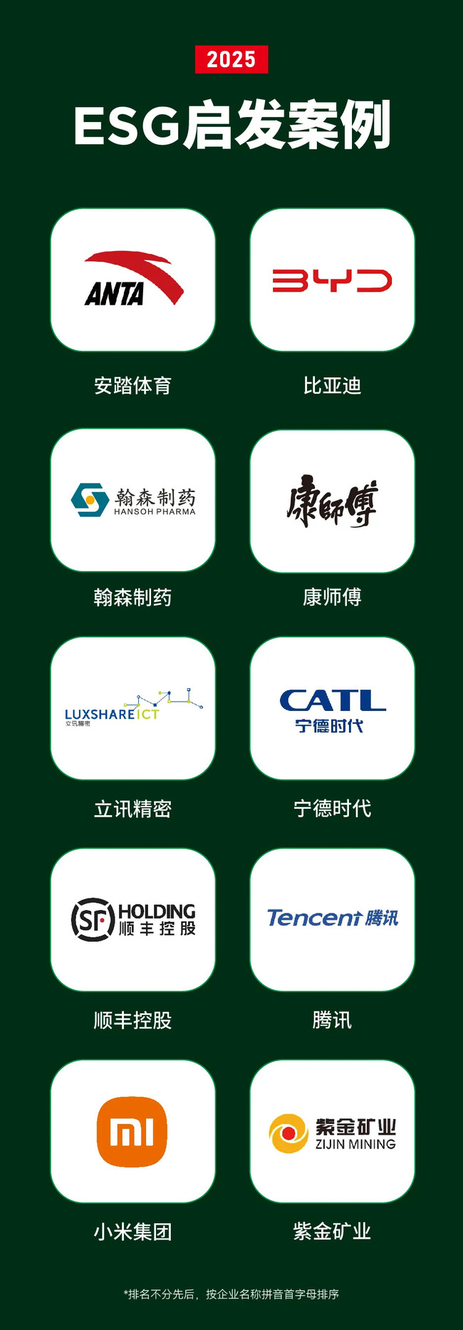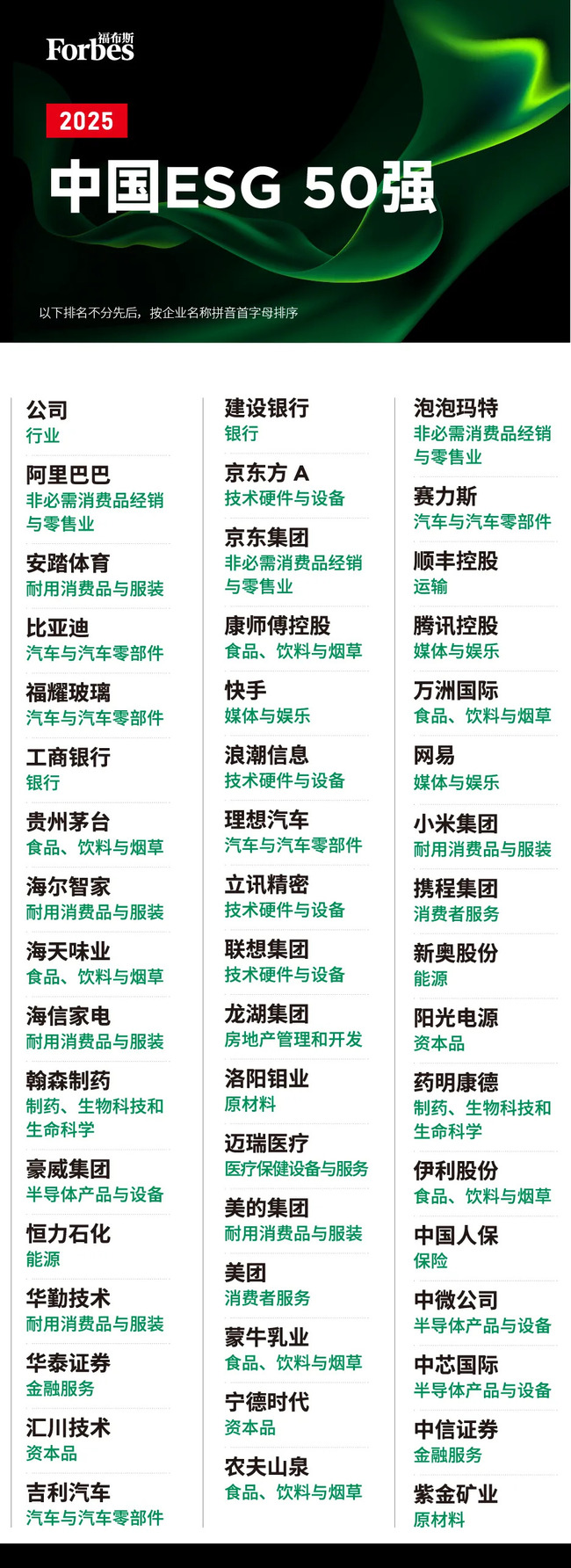 以下为福布斯中国2025中国ESG 50完整名单: