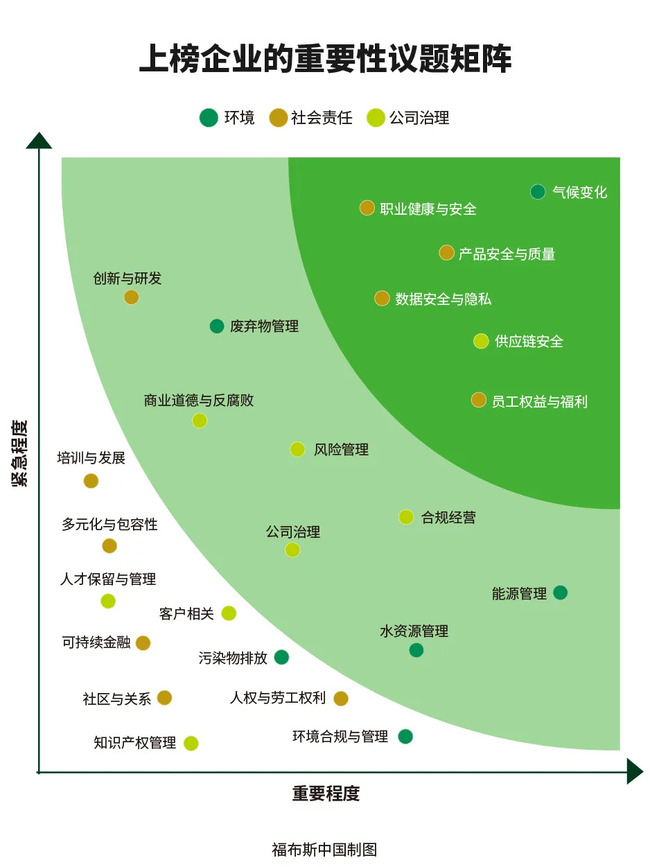 同时,今年福布斯中国向百余家上市公司发出调研问卷,围绕环境目标设定、员工权益保障、ESG治理体系建设、数据可靠性提升及未来ESG创新方向等维度展开。