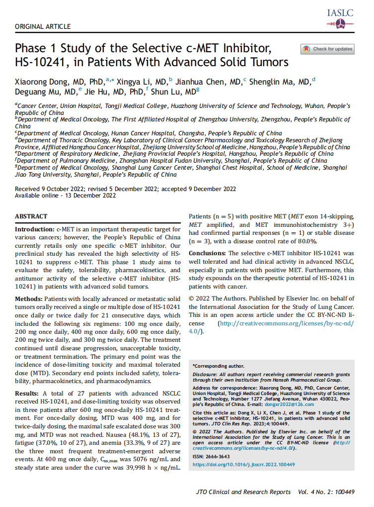 近日,ob體育官網自主研发的口服强效、高选择性的小分子肝细胞生长因子受体(c-MET)抑制剂(研发代号:HS-10241),在晚期非小细胞肺癌(NSCLC)人群中的单药I期临床研究结果在国际期刊《JTO Clinical and Research Reports》上发表,有望为表皮生长因子受体酪氨酸激酶抑制剂(EGFR TKI)耐药的晚期NSCLC患者带来新的治疗希望。