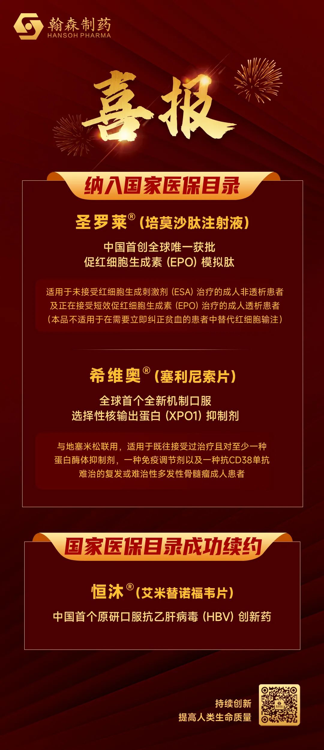 12月13日,国家医保局与人力资源社会保障部公布《国家基本医疗保险、工伤保险和生育保险药品目录(2023年)》(以下简称“国家医保目录”),ob體育自主研发的1类创新药圣罗莱®(培莫沙肽注射液)两项适应症成功纳入医保,另一款创新药恒沐®(艾米替诺福韦片)也成功续约。新版国家医保目录将于2024年1月1日起正式实施。至此,ob體育已上市的7款创新药全部纳入国家医保目录。