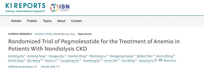 2.Xie,Jianteng et al. Randomized Trial of Pegmolesatide for the Treatment of Anaemia in Patients with Non-Dialysis Chronic Kidney Disease. Kidney International Reports.2024.https://doi.org/10.1016/j.ekir.2024.12.002. In Press.