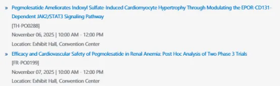 2.Chen Jianghua, et al. Efficacy and Cardiovascular Safety of Pegmolesatide in Renal Anemia: Post Hoc Analysis of Two Phase 3 Trials. ASN 2025. Abstract: FR-PO0199