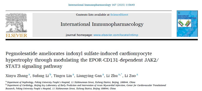 1.Zhang X, Li S, Lin T,et al.Pegmolesatide ameliorates indoxyl sulfate-induced cardiomyocyte hypertrophy through modulating the EPOR-CD131-dependent JAK2/STAT3 signaling pathway.Int Immunopharmacol. 2025 Oct 14;167:115643.