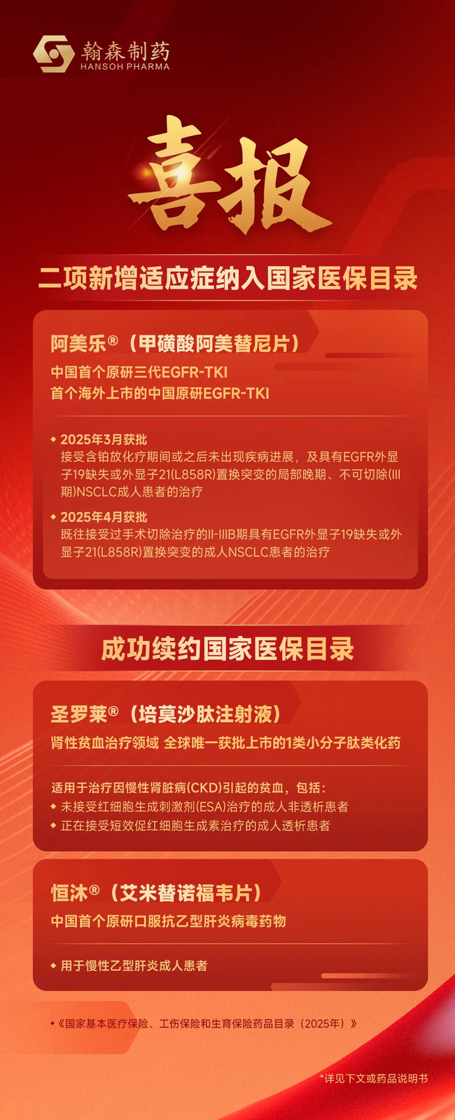 2025年12月7日,ob體育集团有限公司(以下简称“ob體育”,03692.HK)宣布,公司创新药阿美乐®(甲磺酸阿美替尼片)二项新增适应症成功纳入《国家基本医疗保险、工伤保险和生育保险药品目录(2025年)》(“2025国家医保目录”),圣罗莱®(培莫沙肽注射液)、恒沐®(艾米替诺福韦片)所有适应症续约纳入2025国家医保目录。新版国家医保目录将于2026年1月1日正式实施。