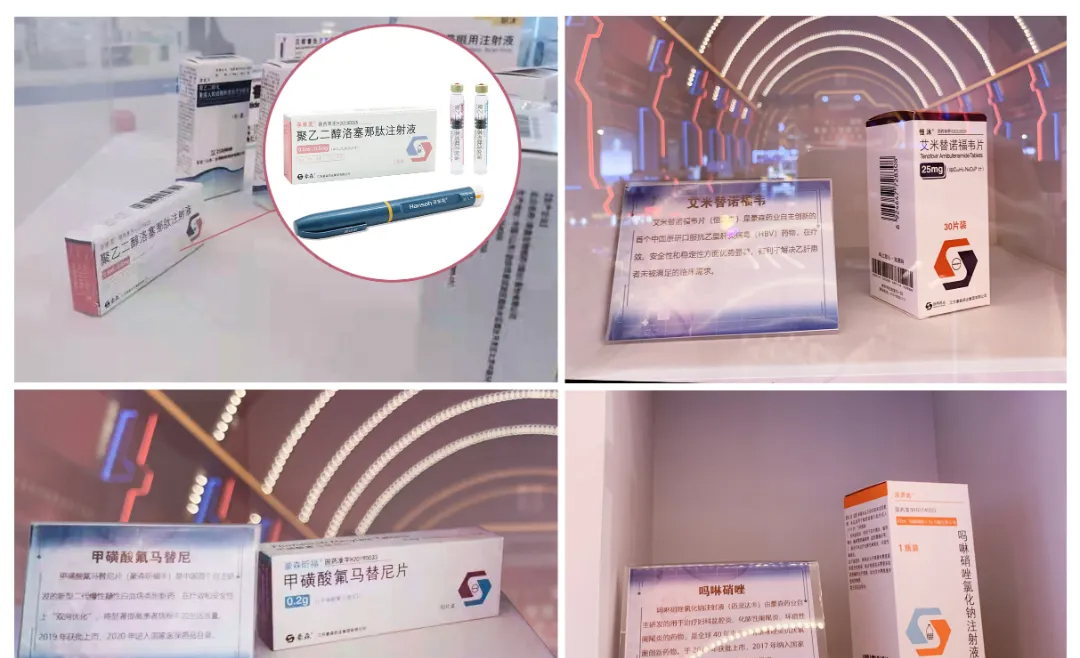 由豪森药业自主研发亮相本次展览的四款1类新药:首个中国原研口服抗乙型肝炎病毒(HBV)药物恒沐®(艾米替诺福韦片),用于慢性乙型肝炎成人患者的治疗,取得了临床亟需新药研发的重大突破,在疗效、安全性和稳定性方面优势显著,有利于解决乙肝患者未被满足的临床需求;豪森昕福®(甲磺酸氟马替尼片)是中国首个自主研发的新型二代慢性髓性白血病类创新药,在疗效和安全性上“双向优化”,将显著提高患者病程中的生活质量,已被中国慢性髓性白血病诊断与治疗指南推荐为一线用药;孚来美®(聚乙二醇洛塞那肽注射液),作为我国首个自主创新长效GLP-1类降糖药物,也是全球第一款PEG化的长效降糖药物,降糖疗效明确,安全性高,且每周仅需注射一次,为中国糖尿病患者提供了新的用药选择;迈灵达®(吗啉硝唑氯化钠注射液)是全球40年来首个硝基咪唑类抗厌氧菌创新药物,拥有更好的疗效和更高的安全性,有效减轻了患者用药风险,具有良好的临床价值。豪森昕福®、孚来美®、迈灵达®均为国家医保目录品种。