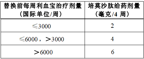 | 【用法用量】 | 在开始本品治疗前,应纠正或排除其他贫血原因(如维生素缺乏、代谢或慢性炎症疾病、出血等)。 给药方式为每4周一次,皮下注射。本品不得通过静脉注射给药。 本品应当在具备肾性贫血治疗经验的专业医疗人员监督指导下使用。 1.未接受ESA治疗的非透析患者: 初始剂量 当患者血红蛋白(Hb)水平低于10.0g/dL时,开始本品治疗。 本品的初始给药剂量为0.04mg/kg,每4周一次,皮下注射。 剂量调整 在起始治疗阶段,建议每2周监测1次Hb水平,直至其达到稳定,随后每4周监测1次Hb。治疗期间建议根据患者当前贫血程度及过去4周内Hb变化情况,每4周进行一次剂量调整,以使Hb水平达到目标范围(一般为10.0~12.0 g/dL,可参考临床指南进行个体化调整),单次最大给药量为0.08mg/kg(按公斤体重计算)。 推荐的剂量调整方法如下: 如果Hb水平在12.0~13.0g/dL内,则减量25%。 如果Hb水平超过13.0g/dL,暂停给药直至Hb≤12.0 g/dL,之后按末次用药剂量减少25%。 在起始治疗阶段,如果Hb水平上升速度过快,可下调给药剂量,或根据医师判断暂停给药,以缓解快速应答:如在2周时间内上升超过1.0g/dL或在4周时间内上升超过2.0 g/dL,可将培莫沙肽的剂量减少25%;如在2周时间内上升超过2.0g/dL或在4周时间内上升超过3.0g/dL,可将培莫沙肽的剂量减少50%。 如果为使Hb维持在10.0g/dL以上而需要上调培莫沙肽给药剂量,可按照当前用药剂量约25%或50%的比例每4周上调用药剂量。 剂量调整频率不得超过每月1次。 2.正在接受利血宝治疗的透析患者: 正在接受短效促红细胞生成素治疗且血红蛋白水平稳定的患者,在转换为本品治疗后可能会出现明显的Hb水平波动,建议转换前进行充分的获益风险评估,谨慎转换。 初始剂量 目前正在接受利血宝治疗的慢性肾脏病(CKD)透析患者可以换用本品治疗。本品的初始剂量应根据患者换药前每周利血宝的用药剂量按表1进行换算。替换过程中,患者在接受最后一次促红细胞生成素给药后,需间隔一周才能接受首次培莫沙肽给药。 表1.促红细胞生成素的剂量换算表 剂量调整 治疗期间应根据患者 Hb 水平变化情况调整本品剂量, 以使 Hb 水平达到目标范围 ( 一般为 10.0~ 12.0 g/dL ,可参考 临床指南进行个体化调整),之后以该剂量进行维持治疗。 在替换治疗初期,建议每 2 周监测 1 次 Hb 水平,直至 其达到稳定,随后每 4 周监测 1 次 Hb 。治疗期间建议根据 患者当前贫血程度及过去 4 周内 Hb 变化情况,每 4 周进行 一次剂量调整,以使 Hb 水平维持在目标范围,单次最大给 药剂量为 6 mg。如实际给药剂量在最低维持剂量 0. 1 mg 时, Hb 仍在 11.0~ 12.0 g/dL 范围或上升速度过快,推荐暂停给药。 推荐的剂量调整方法如下: 如果 Hb 水平在 11.0~ 12.0 g/dL 内,则减量 25%。 如果 Hb 水平超过 12.0 g/dL ,暂停给药直至 Hb≤11.0 g/dL ,之后按末次用药剂量减少 25%。 在替换治疗初期,如果 Hb 上升过于迅速,如在 2 周时 间内上升超过 1.0 g/dL 或在 4 周时间内上升超过 2.0 g/dL ,可将培莫沙肽的剂量减少 25%;如在 2 周时间内上升超过 2.0 g/dL 或在 4 周时间内上升超过 3.0 g/dL ,可将培莫沙肽的剂 量减少 50% ,以缓解快速应答。 如果为使 Hb 维持在 10.0 g/dL 以上而需要上调培莫沙肽 给药剂量,可按照当前用药剂量约 25%的比例每 4 周上调用药剂量。 剂量调整频率不得超过每月 1 次。 应答不佳 在对本品应答不佳的患者中,应考虑是否存在应答不佳 的其它原因,如排除导致 ESA 低应答的其它因素仍应答缺失, 考虑继续治疗对患者无获益,可更换治疗(见【注意事项】)。 中断治疗 通常本品的治疗属于长期治疗,可根据医嘱在任何时间中断治疗。 漏用剂量 如果漏用了 1 剂培莫沙肽,应尽快补充注射漏用的剂量, 然后按照处方的给药频率重新开始接受培莫沙肽治疗。 特殊人群的剂量调整 肝功能不全:暂无肝功能不全患者的研究数据。 老年人:老年患者无需进行剂量调整(参见【老年用药】)。 儿童:尚无本品用于 18 岁以下患者的临床研究资料。 |